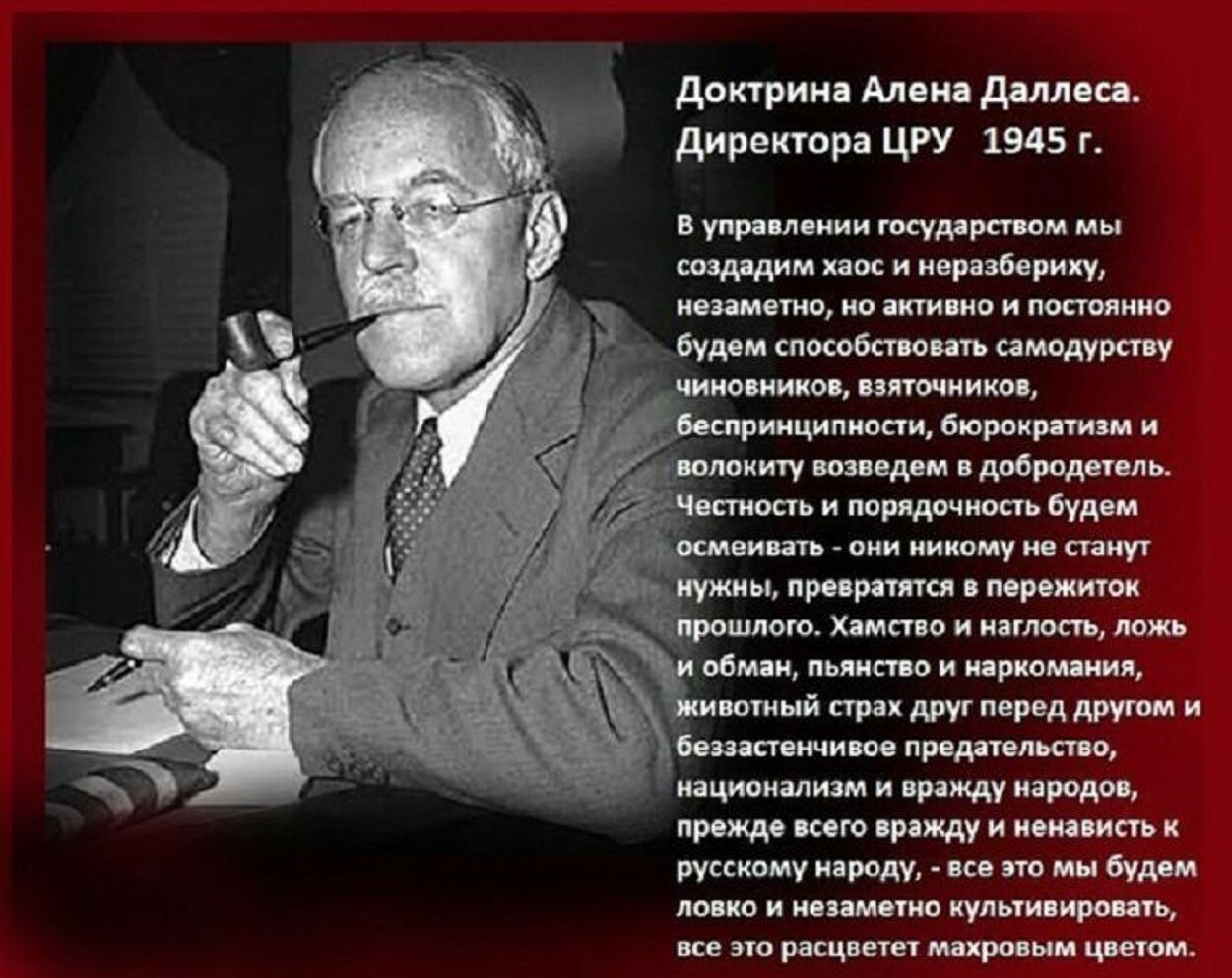 Инструкции основателя ЦРУ Аллена Даллеса (с русским лицом), созвучны католическим бредням, не будет сенсацией, если откроется дверь тайны тьмы, Даллес являлся агентом ордена иезуитов: